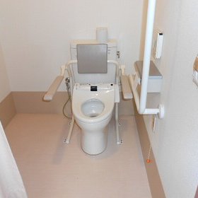 少し広めの手摺付きのトイレです。安心して体を預けごゆっくりどうぞ。